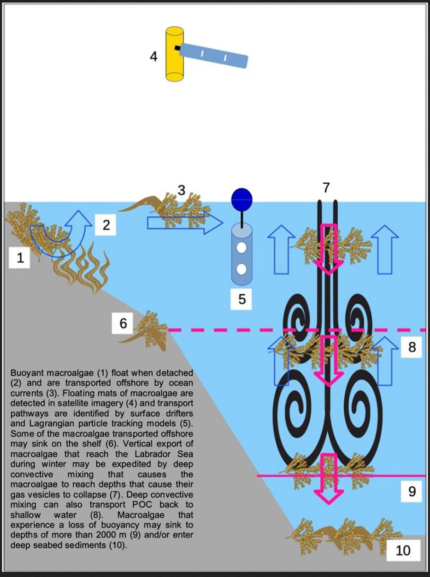 Macroalgal carbon export estimates make assumptions about lateral transport away from the coast and vertical export to deep ocean sinks. Yet, few studies have resolved these pathways. This paper tests lateral surface transport and vertical export assumptions using the Southwest Greenland continental shelf and the Labrador Sea as a testbed. Macroalgae grow on Greenland's rocky shoreline and previous studies have documented oceanographic connectivity between coastal and offshore regions. This study analyzed 1380 Sentinel-2 satellite images to find 7973 patches of floating macroalgae on the SW Greenland shelf and in the Labrador Sea, providing evidence of their presence on the shelf and offshore waters. Since satellite imagery provides a snapshot of macroalgal positions at a given time, 305 surface drifter trajectories and a Lagrangian particle tracking model (LPTM) are used to quantify residence times and transport pathways. The average drifter-derived surface residence times on the SW Greenland shelf and the Labrador Sea are 12.1 days and 63.6 days, respectively. Applying results from studies of macroalgal longevity, the drifter-derived residence times suggest that macroalgae can remain intact during their transit of the shelf, allowing them to sink in deeper water offshore. The LPTM traced the origins and pathways of selected patches in June 2018. To explore vertical export mechanisms, a Large Eddy Simulation revealed that deep convection can transport buoyant macroalgae to depths where their gas vesicles implode, expediting sinking. These interdisciplinary findings indicate that Greenland's macroalgal ecosystems can supply detrital carbon to the adjacent shelf and open ocean and highlight the importance of testing key transport assumptions used to estimate macroalgal contributions to carbon sequestration.