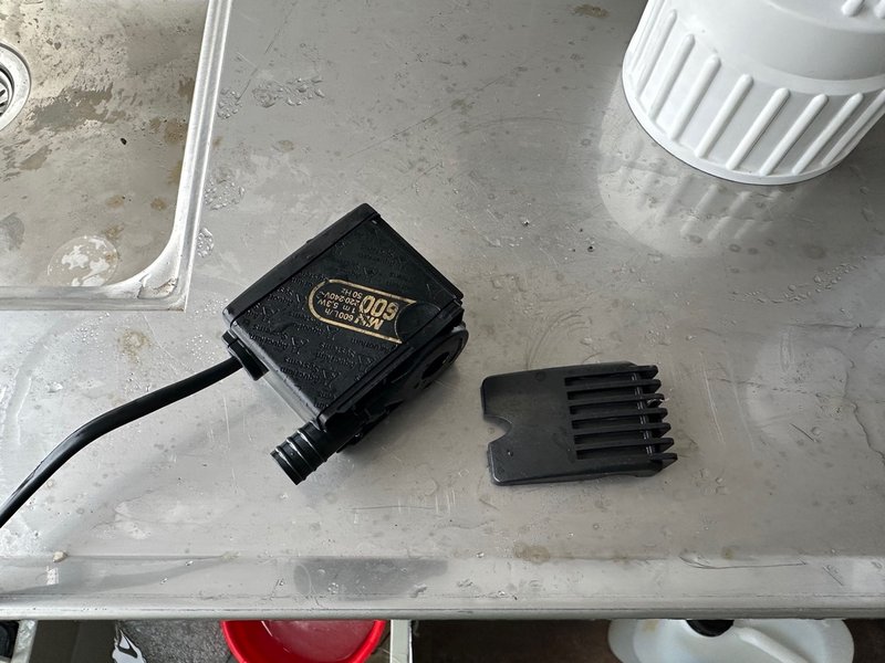 The next morning, I found an old aquarium pump in one of the crates in the boat house. While I had planned on using the built-in Contros pump to mix water in my experiment, I was able to make a new system with a little bit of tubing, plastic fittings, and electrical tape, that still pumped water to the instrument head. This made it possible to at least get the second treatment of my experiment done. However, as I took out the rubber stopper on my water jug to start prepare for the next run, one of the glass tubes broke and a small piece lodged in the aquarium pump, breaking the motor. Now I was two pumps down. Without any other option I took apart the aquarium pump and put it back together again and after a while got it spinning.